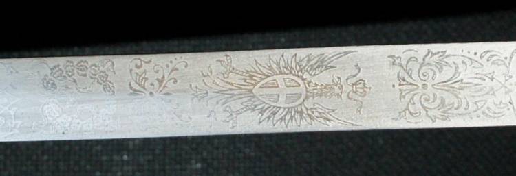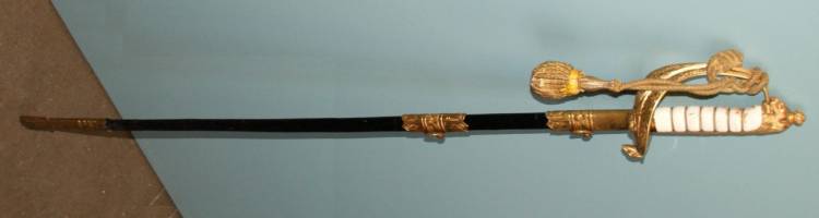 SPADA DA UFFICIALE DELLA REGIA MARINA. LAMA INCISA. SCUDO SABAUDO V.E.III. CAPPETTA INF. INCOLLATA. COMPLETA DI DRAGONA E CUSTODIA IN PANNO VERDE.