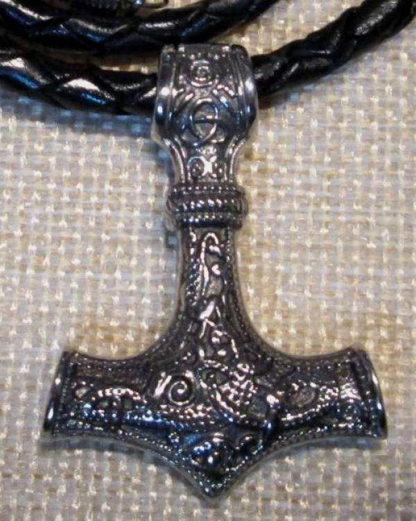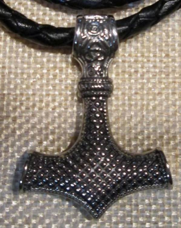Pendente (cm.4,5) in acciaio di ottima fattura raffigurante il Martello (Mjollnir) di Thor, Dio norreno del fulmine e della guerra, con inciso sul fronte il Serpente Garmungandr.