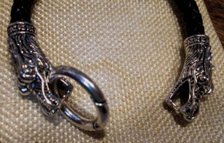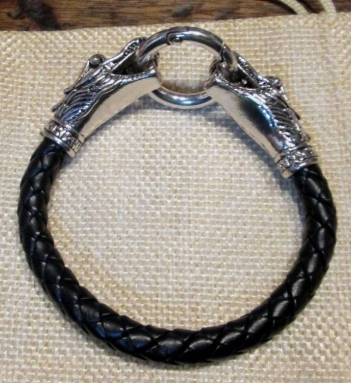 Bracciale in pelle di ottima fattura con i finali a Testa di Drago in lega. Chiusura circolare a molla in acciaio. Non è solamente un bel gioiello da indossare o collezionare, ma un potente talismano foriero di forza e vittoria.