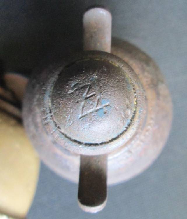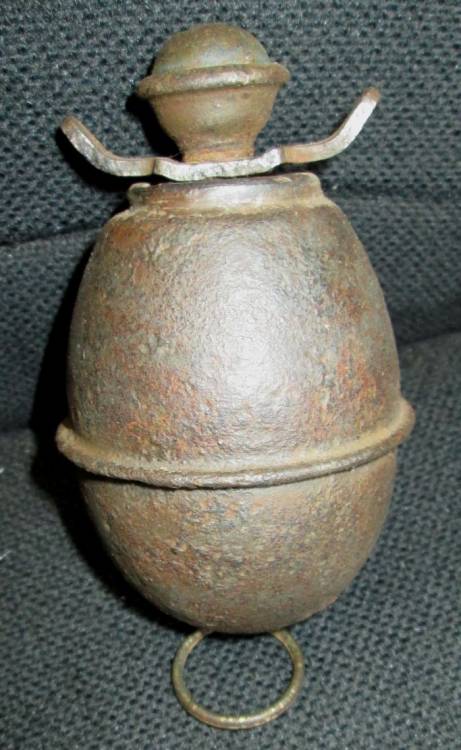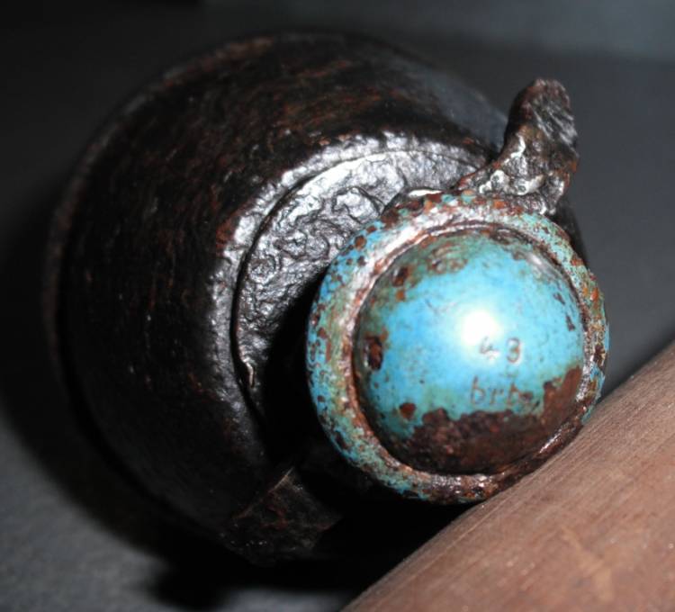 BOMBA A MANO A UOVO TEDESCA I°TIPO, TAPPO COLOR AZZURRO-RITARDO 4 1/2 sec. CONSERVA TRACCE DI VERNICE ORIGINALE. MARCATA ´fzl 44´ SUL TAPPO.