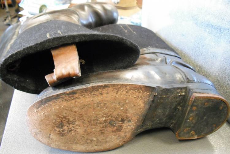 IN FELTRO NERO E CUOIO MARRONE. NUMERO GRANDE, ORIENTATIVAMENTE 44/45. PORTATI MA IN SPLENDIDO STATO DI CONSERVAZIONE. RINFORZO LATERALE IN CUOIO CON SIGLA E NUMERI. RARI.