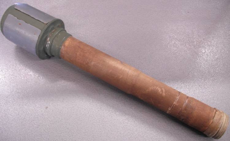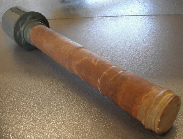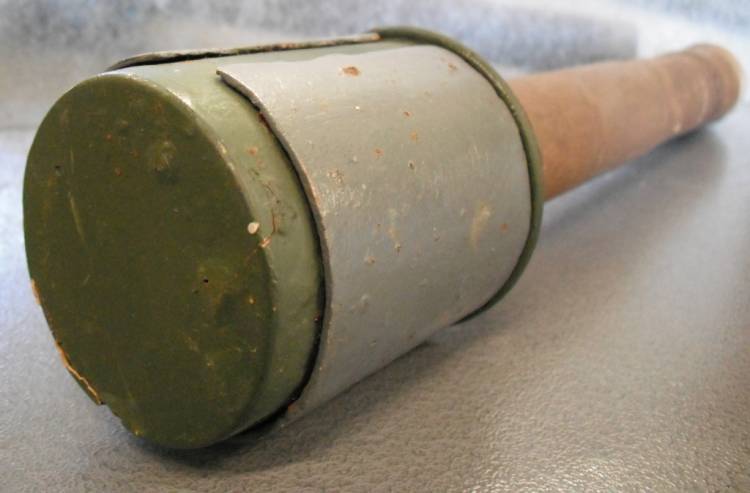 BOMBA A MANO CON MANICO MOD.24 CON CAMICIATURA SUPPLEMENTARE AMOVIBILE PER MOLTIPLICARE L´EFFETTO SCHEGGE. DI SCAVO. TESTA, CAMICIATURA AGGIUNTIVA E TAPPO TERMINALE CON VERNICE ORIGINALE RICONDIZIONATA. MANICO IN LEGNO NON ORIGINALE, REALIZZATO ARTIGIANALMENTE E AGGIUNTO POSTERIORMENTE AL RITROVAMENTO. INERTE.