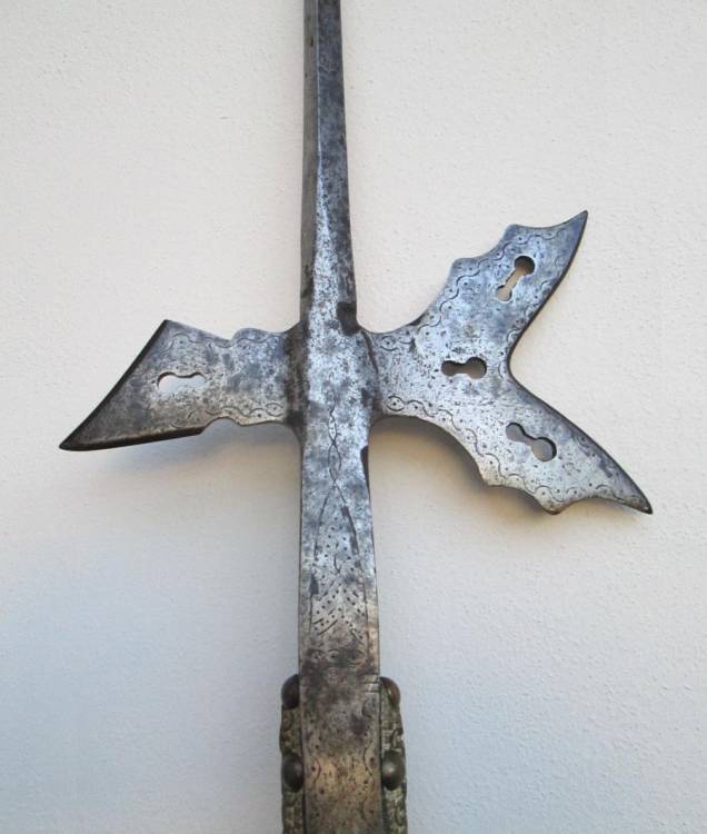 Alabarda con robusta cuspide a sezione romboidale. Fendente e becco traforati ed incisi.