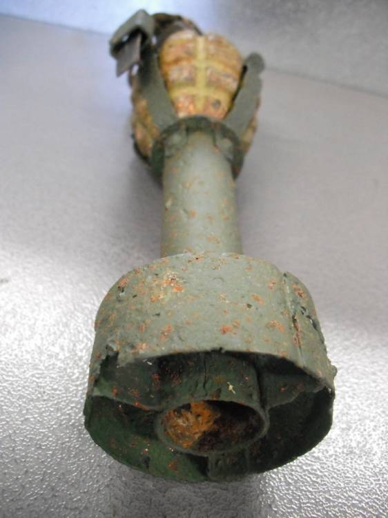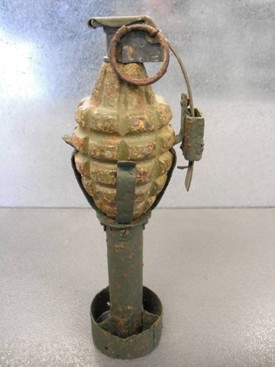 BOMBA AMERICANA TIPO "ANANAS" MK 2 MONTATA SU CODOLO PER IL LANCIO MEDIANTE FUCILE GARAND. DI SCAVO MA ANCORA IN BUONE CONDIZIONI. CON NUMERI E SIGLE IMPRESSI SULLA TESTA DELLA LINGUETTA, ANCORA BEN VISIBILI. VERNICE ORIGINALE. INERTE