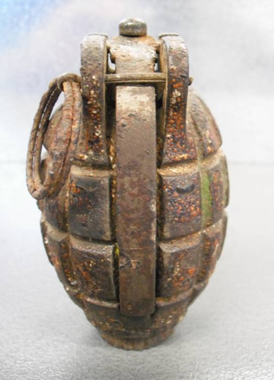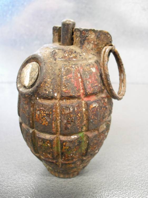 BOMBA A MANO INGLESE TIPO MILLS n°36 Mod. MKI. COMPLETA. BUONE CONDIZIONI. MARCHI E SIGLA ANCORA VISIBILI SUL FONDO DEL CORPO DELLA GRANATA.