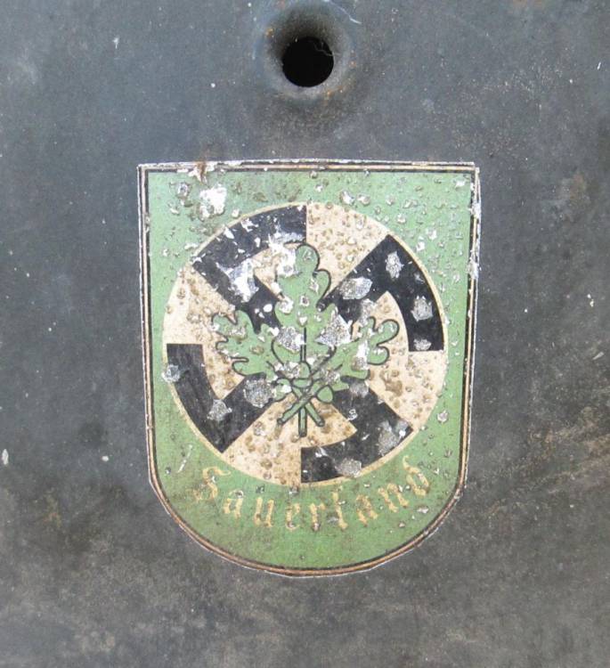 RARISSIMO ELMETTO M.42 MONODECAL DEL BATTAGLIONE ´FREIKORPS SAUERLAND´ UNITA´ DI VOLONTARI (2-3000 UOMINI) COSTITUITA NEL 1944 ED UNITASI A REPARTI DELLE SS NELLA ZONA DEL NORTH-RHINE-WESTFALIA, DIFENDENDO NELL´APRILE DEL 1945 LE CITTA´ DI LIPPSTADT, OLSBERG ED ALTENBUREN.