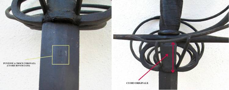 ELEGANTE SPADA DA LATO (RAPIER) A 5 PONTI CON BRACCI DELL´ELSO E DELLA GUARDIA ALLUNGATI E RINGROSSATI ALLE ESTREMITA´. LAMA A SEZIONE ESAGONALE CON PUNZONE AL FORTE (CROCE CORONATA DA CUORE ROVESCIO). IMPUGNATURA IN LEGNO FASCIATO DI FILO DI OTTONE.