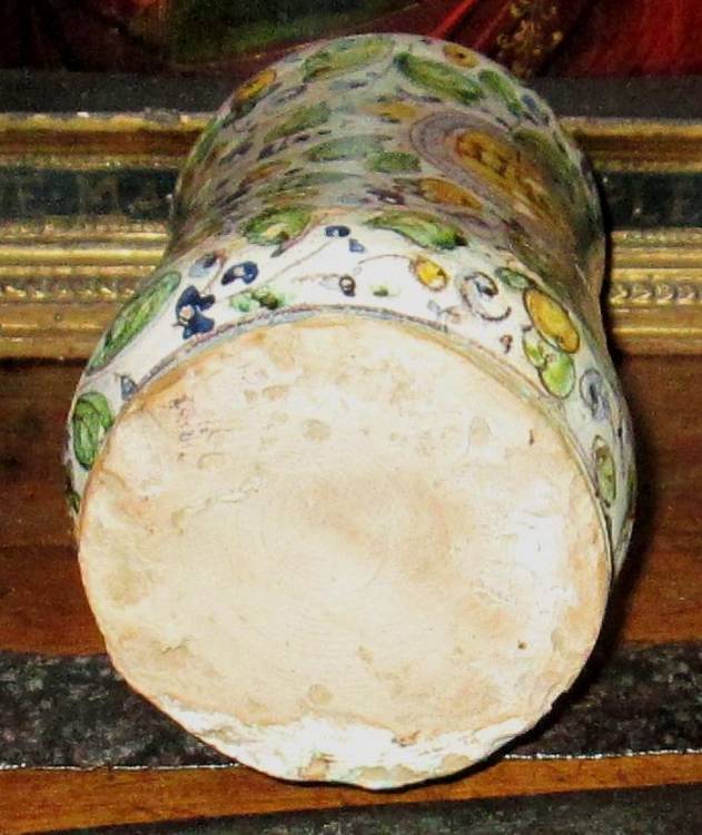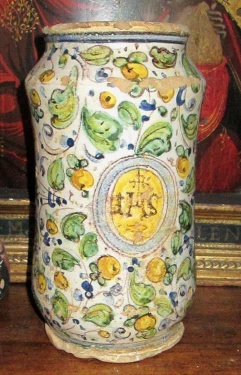 Albarello in ceramica policroma di area fiorentina. Prodotto a cavallo del ´6/700 per contenere prodotti di farmacia.