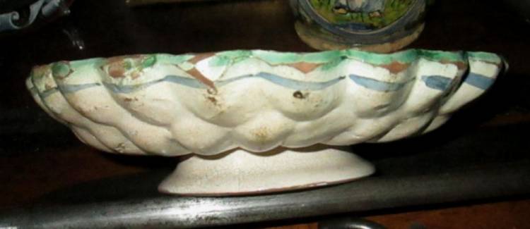 Crespina in ceramica policroma di area fiorentina. Prodotta nei primi decenni del 1600. Riporta al centro una simbologia sacrale (´coppa alata ed ostia´).