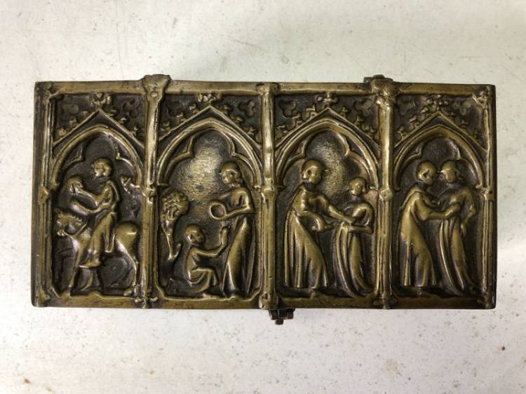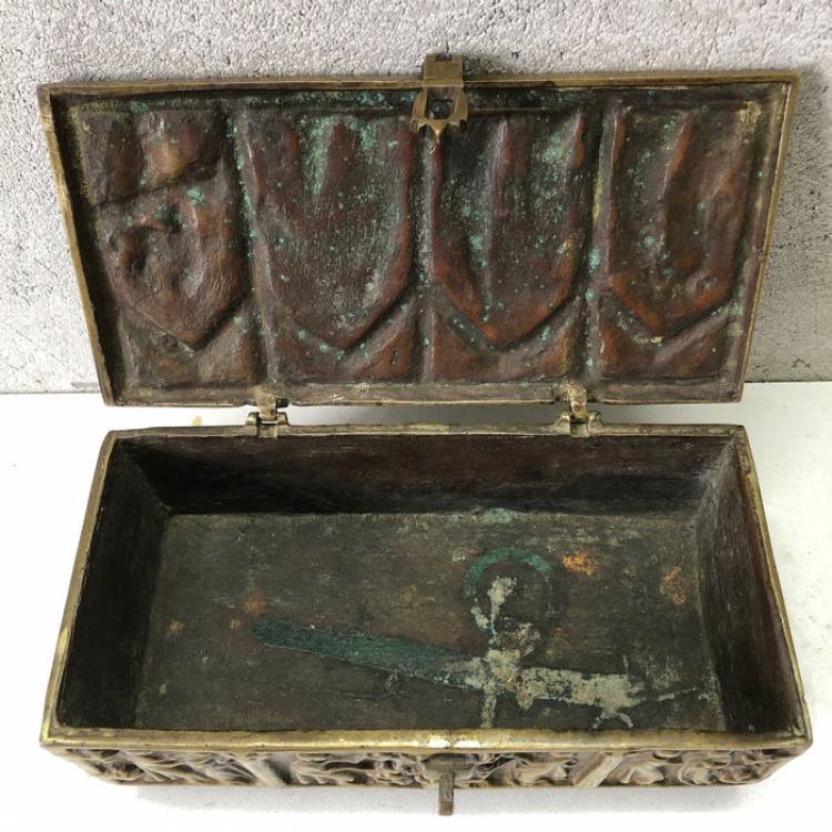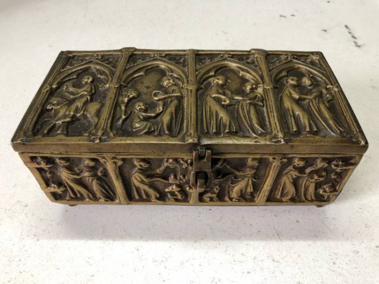 Cassetta Neogotica in Bronzo con Scene sacre a Bassorilievo. Sec. XIX.