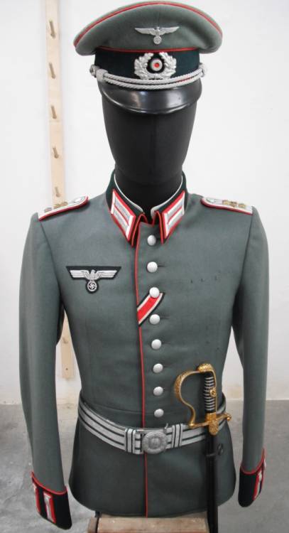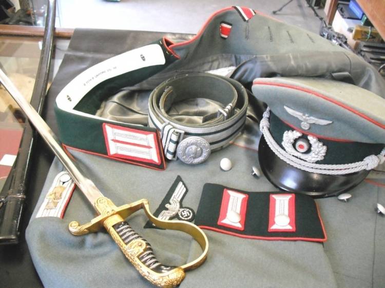 DA PARATA/LIBERA USCITA PER UFFICIALE HEER SPECIALITA´ ARTIGLIERIA. GRADO HAUPTMANN(CAPITANO). COMPOSTO DA GIACCA WAFFENROCK COMPLETA DI MOSTREGGIATURA. KRAGENBINDE (COLLETTO RIGIDO) BIANCO CON MISURA E ISCRIZIONI STAMPATE. AQUILA HEER MODELLO DA UFFICIALE RICAMATA IN CANOTTIGLIA ARGENTO. SUL LATO FRONTALE SINISTRO SONO PRESENTI LE TIPICHE ASOLE PER L´APPOSIZIONE DELLE DECORAZIONI (IN VENDITA A PARTE). NASTRO PER LA CONCESSIONE DELLA CROCE DI FERRO DI II CLASSE CUCITO ALLA TERZA ASOLA. SCHIRMMUTZE COMPLETO. CINTURONE IN BROCCATO E CANOTTIGLIA ARGENTO CON FIBBIA DA UFFICIALE CIRCOLARE. SCIABOLA DA UFFICIALE COMPLETA DI FODERO CON LAMA MARCATA "PUMA SOLINGHEN" DA UN LATO E "N° 3" SULL´ALTRO, AQUILA HEER A RILIEVO SUL GUARDAMANO, CARTIGLIO PER INCISIONE PERSONALIZZATA DEL PROPRIETARIO, VUOTO, SUL LATO OPPOSTO. CONDIZIONI ECCELLENTI.