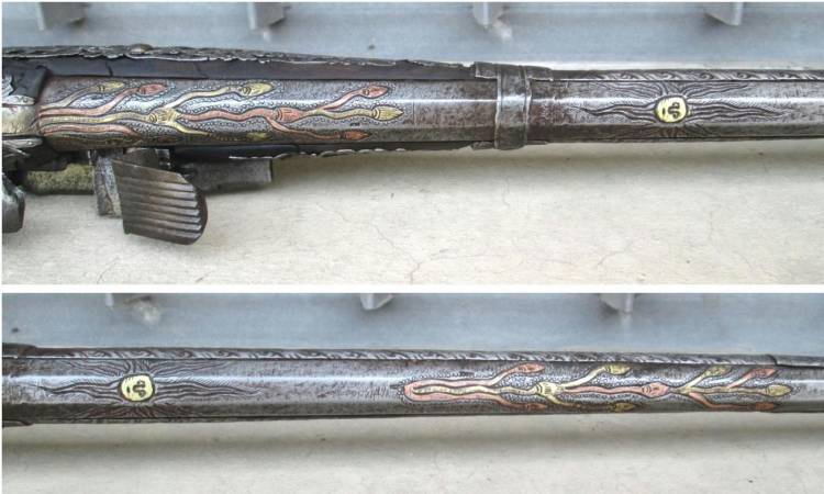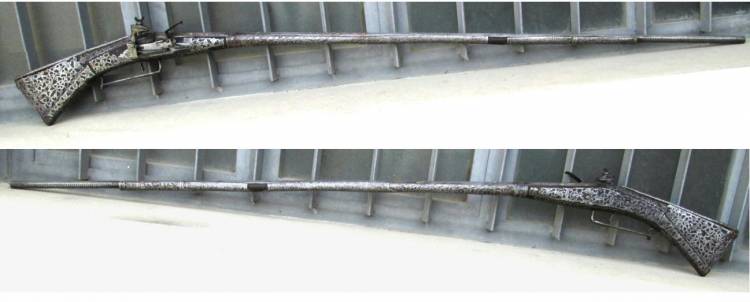 Bellissimo Fucile Sardo a Pietra focaia con lunga canna ottagonale decorata alla culatta con sole raggiato in ottone e fiorami incisi.