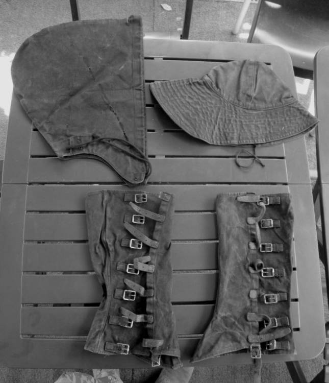 POI RIUTILIZZATO DAL GENIO CIVILE DOPO LA GUERRA. IN EFFETTI ERA NATO COME VESTIARIO IMPERMEABILE DA PONTE PER LA REGIA MARINA AGLI INIZI DEL ΄900, MA IN MANCANZA DI MATERIALE SPECIFICO FU UTILIZZATO A TERRA PER PROTEGGERSI DAGLI ATTACCHI CON I GAS. E΄ COSTITUITO DA UN AMPIO IMPERMEABILE CON CAPPUCCIO, CAPPELLO CON FALDA POSTERIORE E GHETTE IN COTONE PESANTE NERO IMPERMEABILIZZATO. CONDIZIONI MOLTO BUONE.