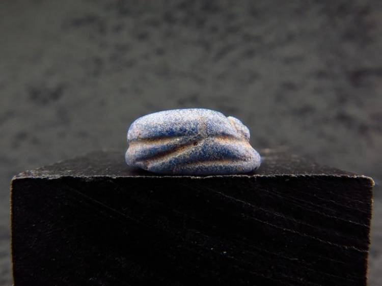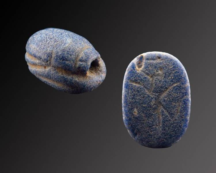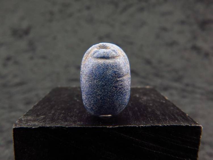 Scarabeo Decorato in Pietra Blu. Antico Egitto, VII sec. a.C., Dim. 14x9x7 mm., Peso 3,5 gr. Condizioni molto buone.