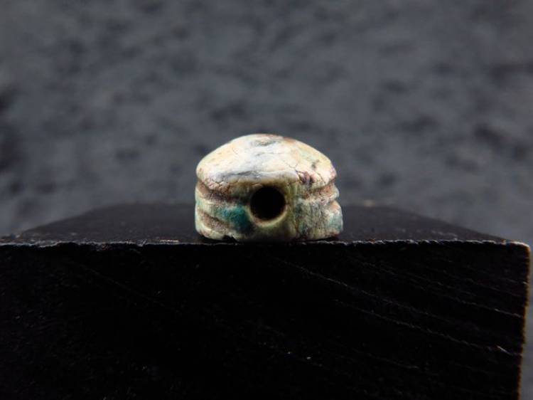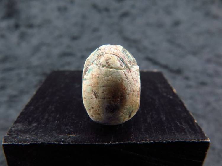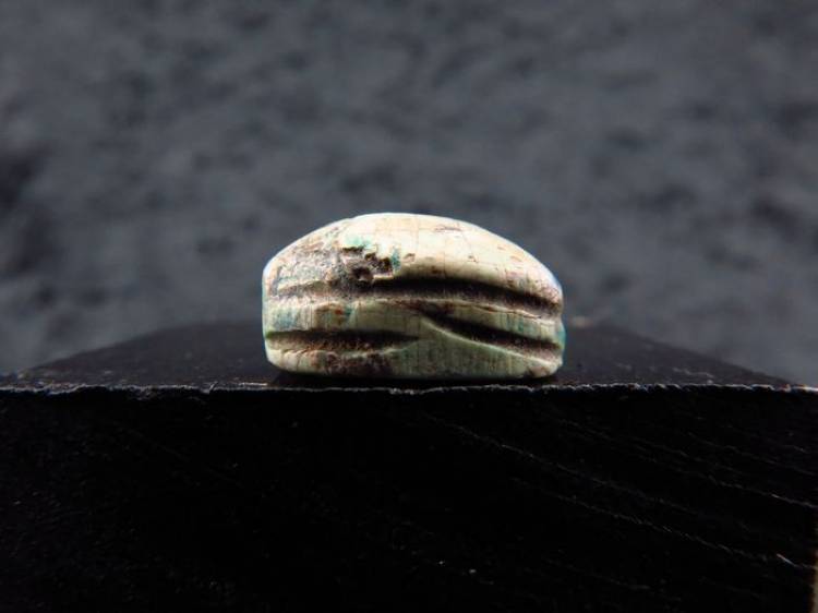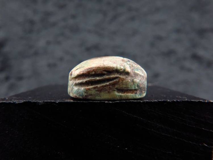 Scarabeo in Steatite verde con i Geroglifici del Dio Amon (o Amon Ra, il Padre di tutti gli Dei). Antico Egitto. XVII-XVI sec. a.C. Dim. 13x10x7 mm. Condizioni molto buone.
