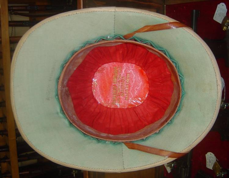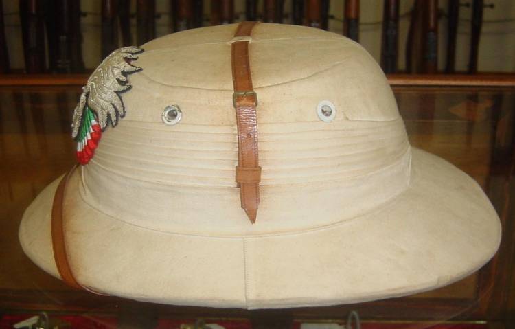 IN SUGHERO RICOPERTO DI STOFFA BIANCO CANAPA. PER UFFICIALE DEI REGI CARABINIERI. COMPLETO. FREGIO RICAMATO IN CANOTTIGLIA ARGENTO, CUCITO SU COCCARDA TRICOLORE. INTERNO COMPLETO IN STOFFA DI COTONE ROSSO; MARCHIO DI FABBRICA "HASSANALY ABDULALLY -casa fondata nel 1900- MASSAUA MADE IN INDIA" CON RESTI DELLA CELLULOIDE ORIGINARIA. ALLUDA IN CUOIO MARRONE. SOGGOLO IN CUOIO MARRONE COMPLETO ED ORIGINALE. NOMINATIVO DEL POSSESSORE SCRITTO SULLA PARTE SOTTOSTANTE IN TELA VERDE CHIARO. CONDIZIONI ECCELLENTI.
