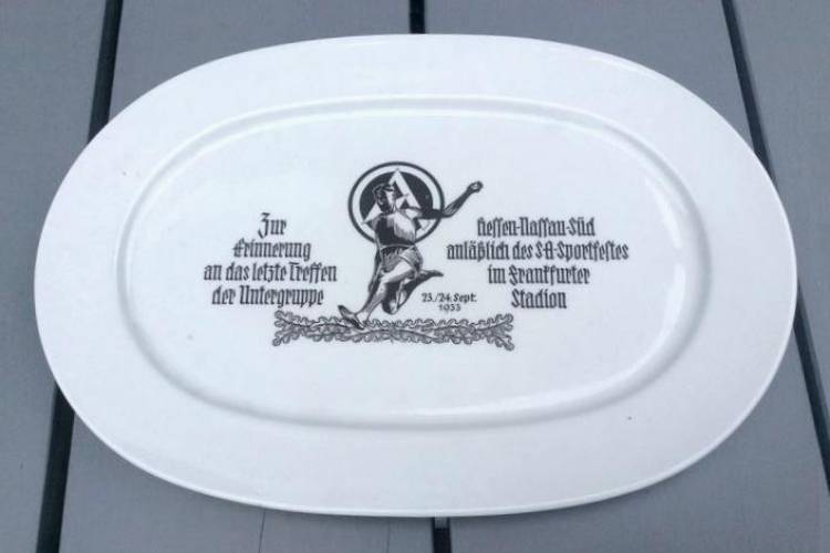 BELLISSIMO VASSOIO IN PORCELLANA COMMEMORATIVO DEL RADUNO SPORTIVO DELLE ´SA´ (´SA TREFFEN´) DEL 1933. MARCA DEL FABBRICANTE NEL SOTTO. CONDIZIONI PERFETTE.
