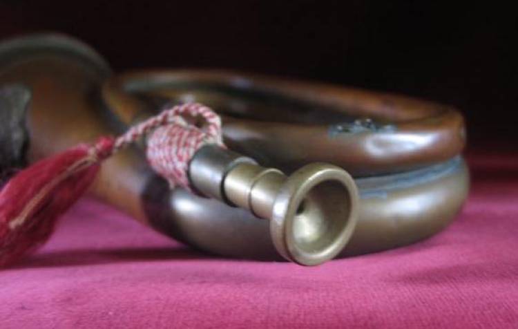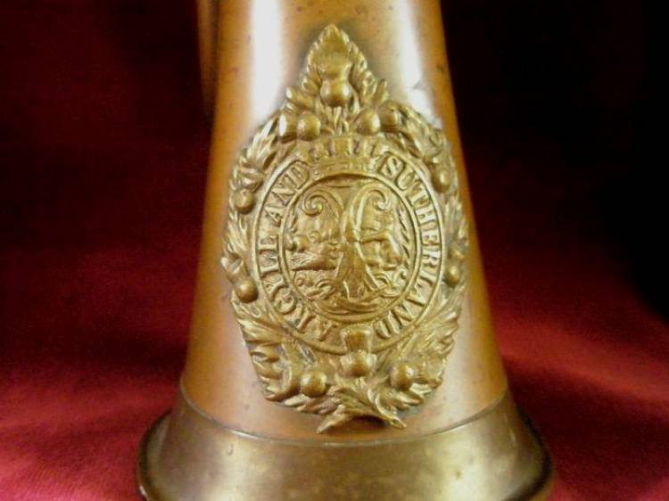 Corno in rame, emblema del ‘Argyll & Sutherland Highlanders Regiment’. Impiegato come Fanteria di linea, fu chiamato per il comportamento eroico nella Guerra di Crimea, ‘Thin Red Line’. Il corno riporta lo stemma con la scritta ´Argyll and Sutherland’.