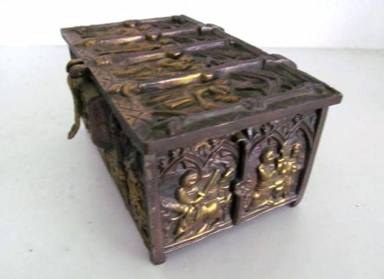 Cassetta Neogotica in Bronzo con Scene scare a Bassorilievo. Sec. XIX. (3).