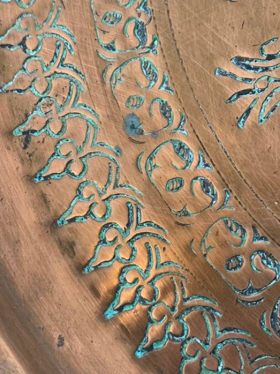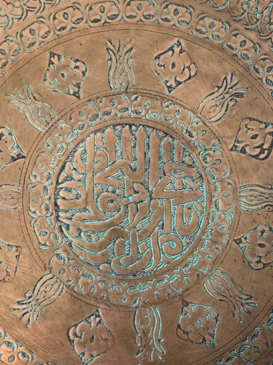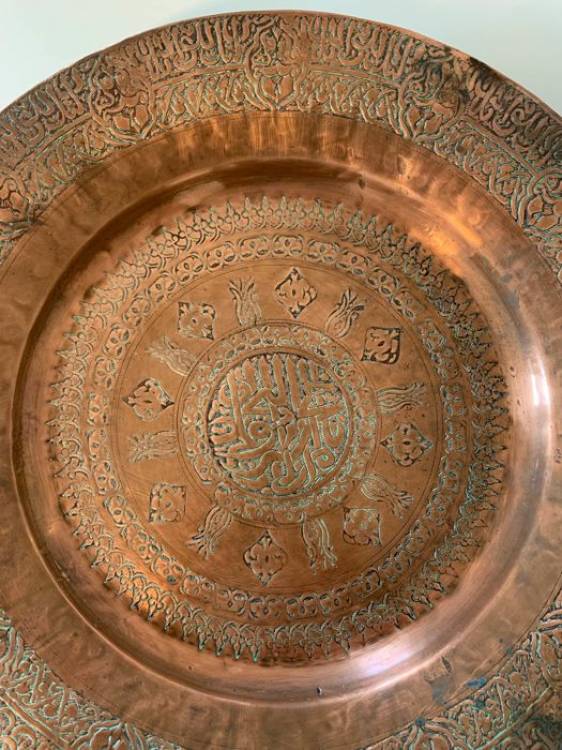 Bel Piatto Ottomano dell´800 con incisioni sul bordo e nel centro riportanti il motto ´Dio č grande´ (´Allah Akbar´) e motivi floreali.