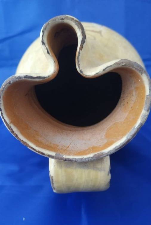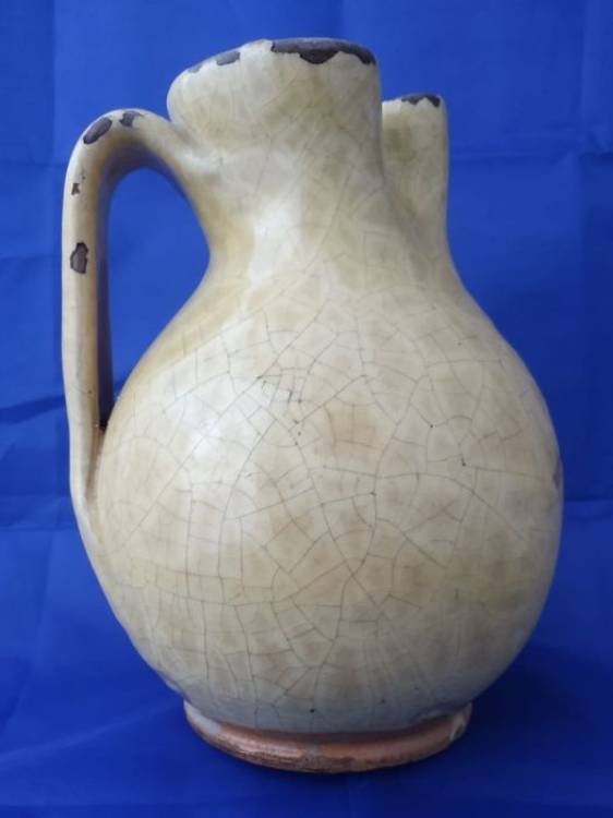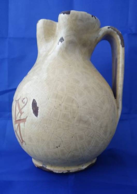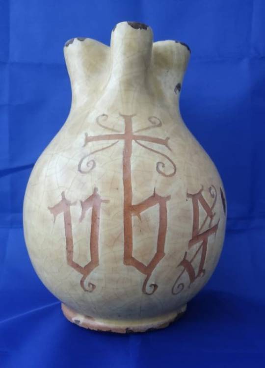 Brocca in maioilica con monogramma ´IHS´ (Iesus Hominum Salvator) sul fronte. Integra, condizioni eccellenti.