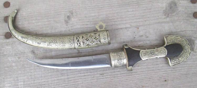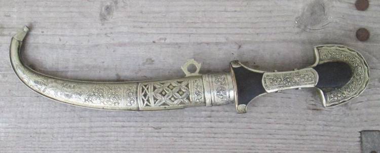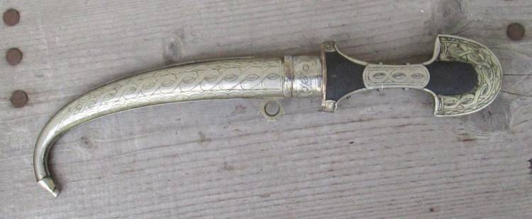 ELEGANTE KOUMMYA (= Kumiyah), PUGNALE TRADIZIONALE MAROCCHINO (BERBERO) AD UN SOLO FILO COMPLETO DI FODERO DEL SECOLO XIX. CONDIZIONI OTTIME.