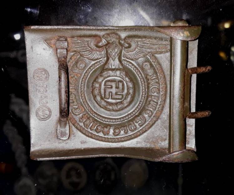 FIBBIA IN ACCIAIO, MARCATA ´SS 36/42 RZM´ (Overhoff-u. Co., Lüdenscheid, Nordrhein-Westphalen) CON VERNICIATURA VERDE.
