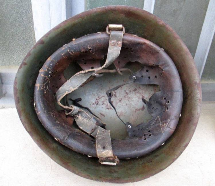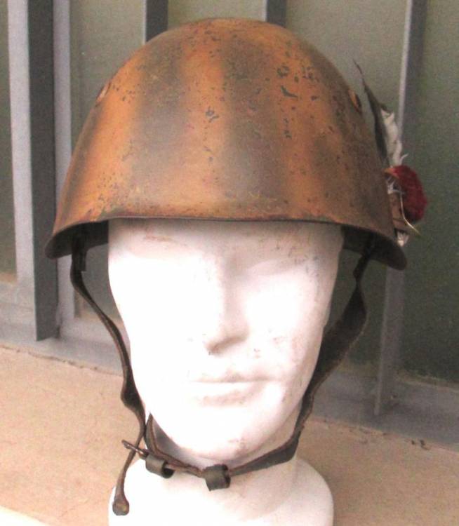 SPLENDIDO E RARO ELMETTO M.33 DELLA REPUBBLICA SOCIALE ITALIANA DELLA DIVISIONE MONTEROSA COMPLETO DI ATTACCO E PENNA DA ALPINO. CLASSICO MIMETISMO A DUE COLORI DEL 1944-45.