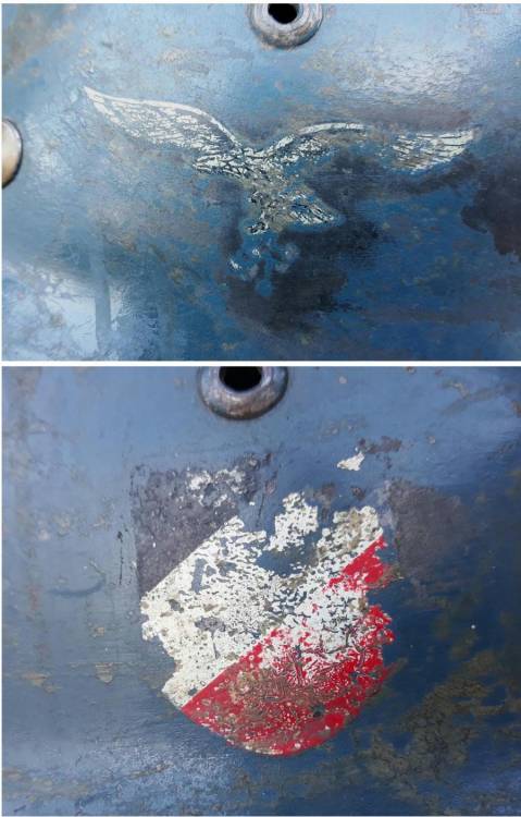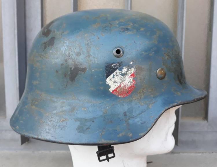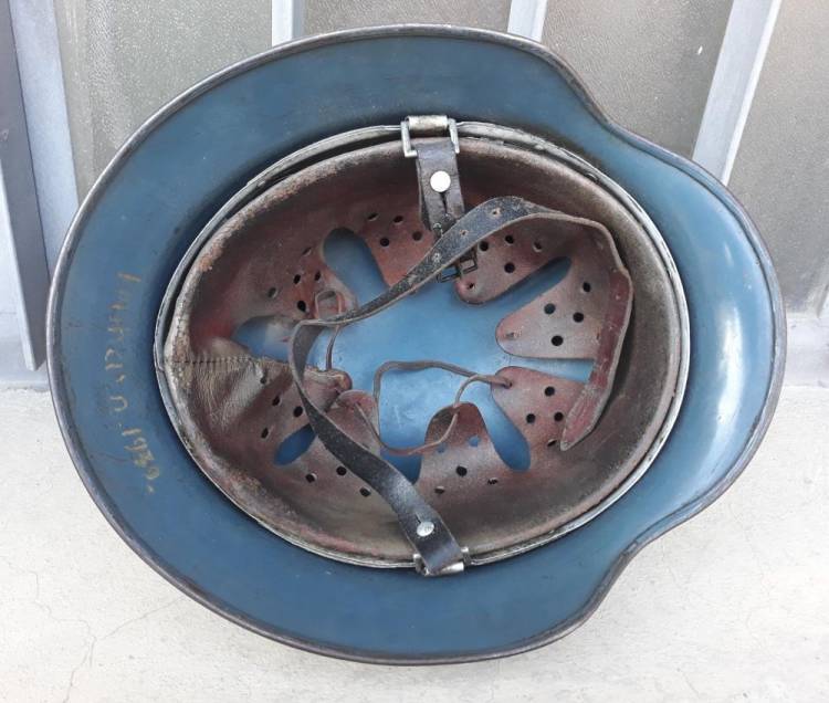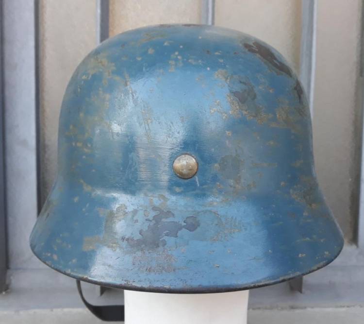 RARO ELMETTO DELLA LW PRIMO TIPO CON COLORAZIONE AZZURRO CHIARO BIFREGIO. PICCOLE TRACCE DI COLORAZIONE DAK POI TOLTA PER L´USO CONTINENTALE. COMPLETO DI INTERNO E SOGGOLO.
