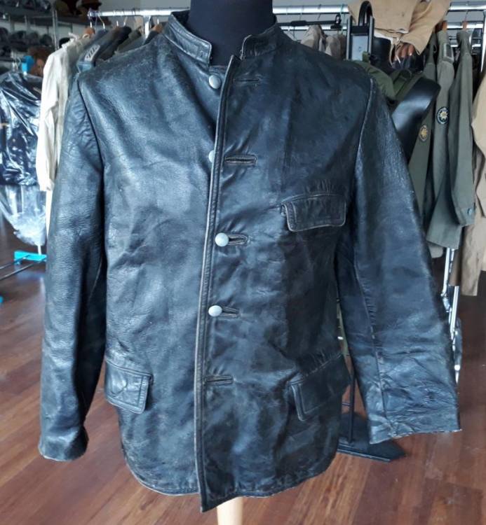 GIACCONE IN PELLE NERA APPARTENUTO AD UN UFFICIALE DELLE WAFFEN SS 12^ PANZER DIVISION ìHITLER JUGEND´ IMPEGNATO NEI COMBATTIMENTI NELLE ARDENNE. IL GIACCONE, INSIEME AI PANTALONI (3337) ED ALLA BUSTINA (3309), E´ STATO TROVATO A PRATO NEGLI ANNI ´90 DALL´AMICO GIANCARLO ERCOLI. CONDIZIONI MOILTO BUONE.