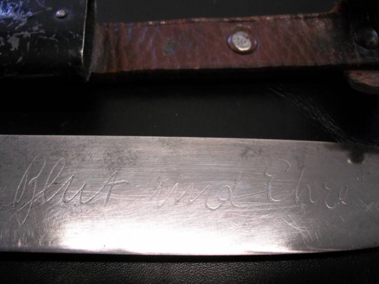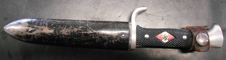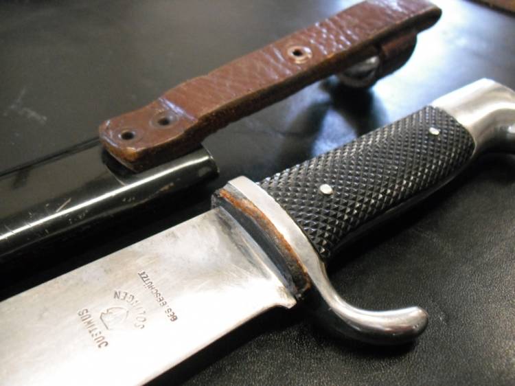 OTTIME CONDIZIONI, PRODUZIONE ANTE 1938 CON MOTTO (BLUT UND EHRE! - REALIZZATO DA CALLIGRAFIA DI BALDUR VON SCHIRACH)INCISO AD ACQUAFORTE SULLA LAMA, SENZA RICASSO (PRIMO TIPO). MARCATO ´JUSTINIUS - SOLINGEN´. DIAMANTE CON CROCE UNCINATA IN SMALTI, INSERITO A PRESSIONE. GUANCETTE IN BACHELITE NERA. FODERO IN METALLO VERNICIATO E CUOIO MARRONE RIVETTATO. MARCHIO MOLTO RARO. PROVENIENZA THOMAS T. WITTMANN.