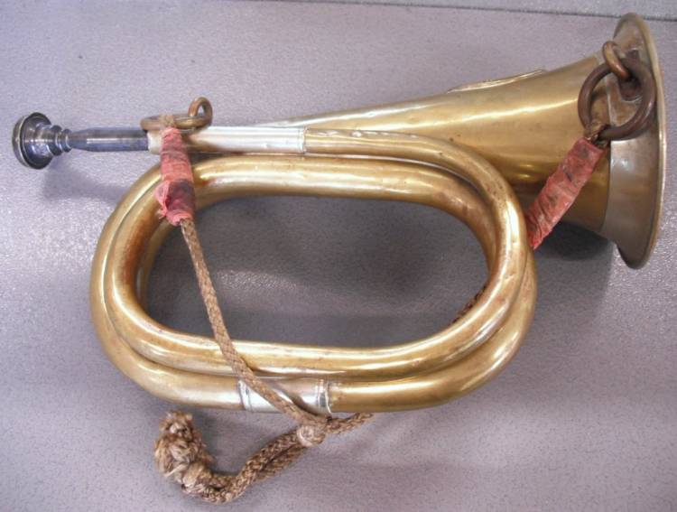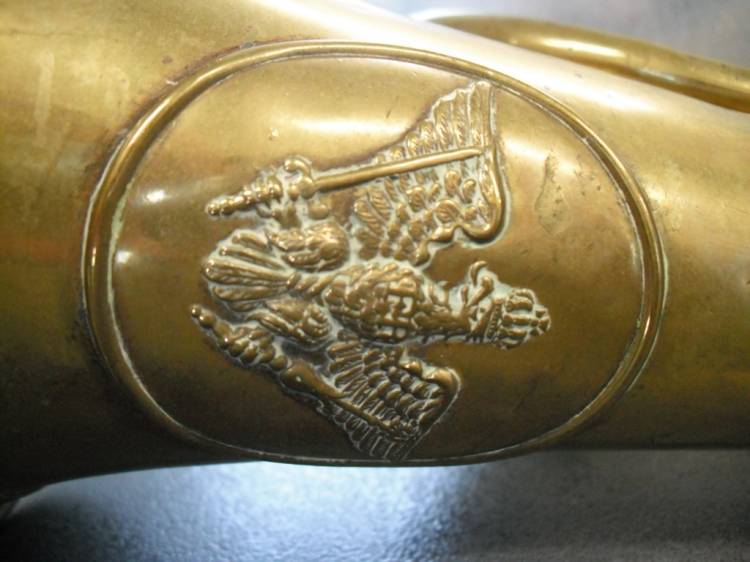 TROMBA DELL´ESERCITO PRUSSIANO; PERIODO FINE ´800. IN OTTONE CON STEMMA: AQUILA CON CORONA E MONOGRAMMA DEL KAISER "FR" (Fredericus Rex), A RILIEVO, INSCRITTA IN OVALE. COMPLETA E ORIGINALE.