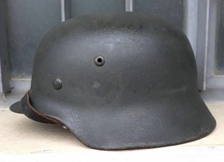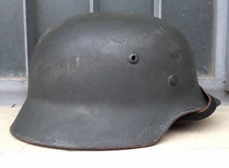 BELLISSIMO ELMO DELL´ESERCITO TEDESCO MOD.35 MONODECAL COMPLETO DI INTERNO E SOGGOLO. LA DECAL STANTE LA NORMATIVA DEL 1940 E´ STATA RIMOSSA DAL SOLDATO (278^ Div. Fanteria - Linea Gotica Adriatico - affiancata dalla 71^ Div. Fanteria reduce dalla battaglia di Montecassino). L´ELMO E´ STATO RECUPERATO DOPO LA BATTAGLIA DI FILOTTRANO. PROVENIENZA: EREDI DEL PRIMO PROPRIETARIO, ANCONA.