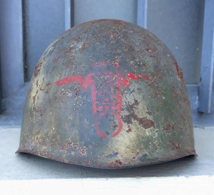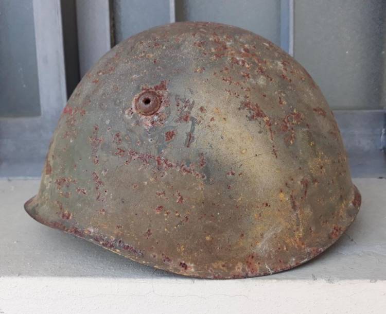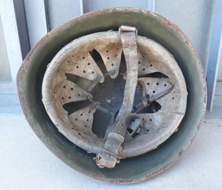 RARO ELMETTO DELLA GNR MOD.33 MIMETICO CON FREGIO ROSSO A VERNICE. RACCOLTO DA CONTADINI NELLE ZONE DI COMBATTIMENTO ANTIPARTIGIANI IN VAL DI SUSA. MAI RIPULITO NE´ RESTAURATO.