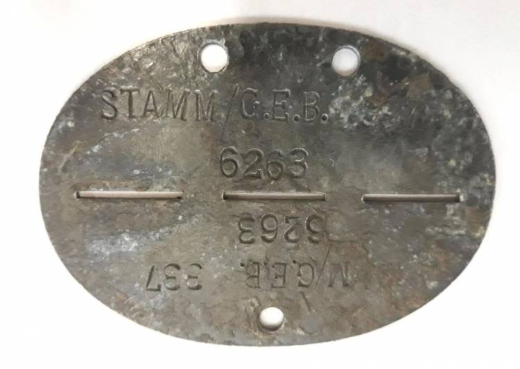 PIASTRINA DI RICONOSCIMENTO IN ZINCO ‘STAMM G.E.B. 337 6263´ (Stamm Grenadier Ersatz Bataillon 337 Matr. 6263). IN SERVIZIO NEL CAMPO DI PRIGIONIA PER TRUPPA E SOTTUFFICIALI A MANTOVA, 11/1943 - 1944.