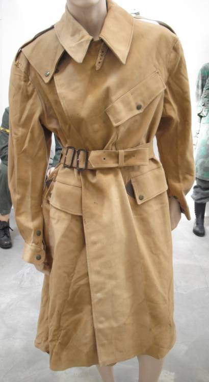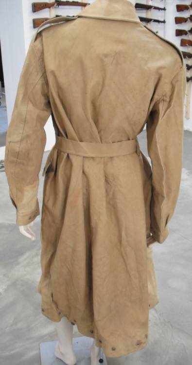 IN TELA GOMMATA PESANTE COLOR CACHI PER MOTOCICLISTA BRITANNICO. POSSIBILITA´ DI ESSERE RIPIEGATO E FISSATO FACENDO PASSARE LE ESTREMITA´ SOTTO AL CAVALLO, MEDIANTE I BOTTONI AUTOMATICI ED IL CINGHIAGGIO INTERNO, PER MAGGIOR COMODITA´ NELLA GUIDA DELLA MOTOCICLETTA. COMPLETO DI TUTTE LE CINGHIE, FIBBIE, BOTTONI E BOTTONI AUTOMATICI TUTTI FUNZIONANTI E MARCATI. TIMBRO OVALE "J.WEINBERG&SONS-MANCHESTER-1942" E TARGHETTA IN CARTA DELLO STESSO FABBRICANTE CON INDICAZIONE IN LINGUA INGLESE "COAT RUBBERPROOFED-MOTOR CYCLISTS"(GIACCONE IMPERMEABILE MOTOCICLISTI). TAGLIA "8"(INDICATA ANCH´ESSA DAL TIMBRO E SULLA TARGHETTA). ORIGINALE BELLICO. CONDIZIONI ECCELLENTI.
