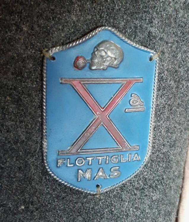 CAPPOTTO DA UFFICIALE DELLA DECIMA MAS. COMPLETO DI GRADI, GLADI DA CAPPOTTO E RARO SCUDETTO DELLA X^ DEL TIPO ´ROSA CORTA´.