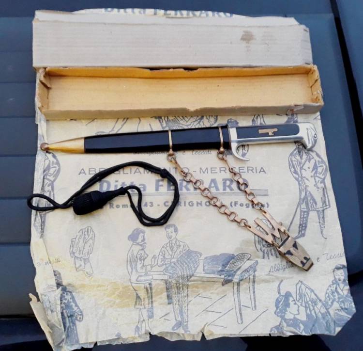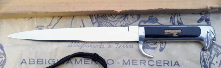 SPLENDIDO PUGNALE A TESTA D´AQUILA MOD.37 COMPLETO DI SOSPENSIONI IN METALLO, NAPPINA E SCATOLA. ANCORA LA CARTA DA CONFEZIONE DEL NEGOZIO DI CERIGNOLA (FG) ADDETTO ALLA VENDITA DEL VESTIARIO MVSN. IL PUGNALE, IN CONDIZIONI PERFETTE ERA APPARTENUTO AL PODESTA´ DI CERIGNOLA, SABINO LABIA (1941-43).