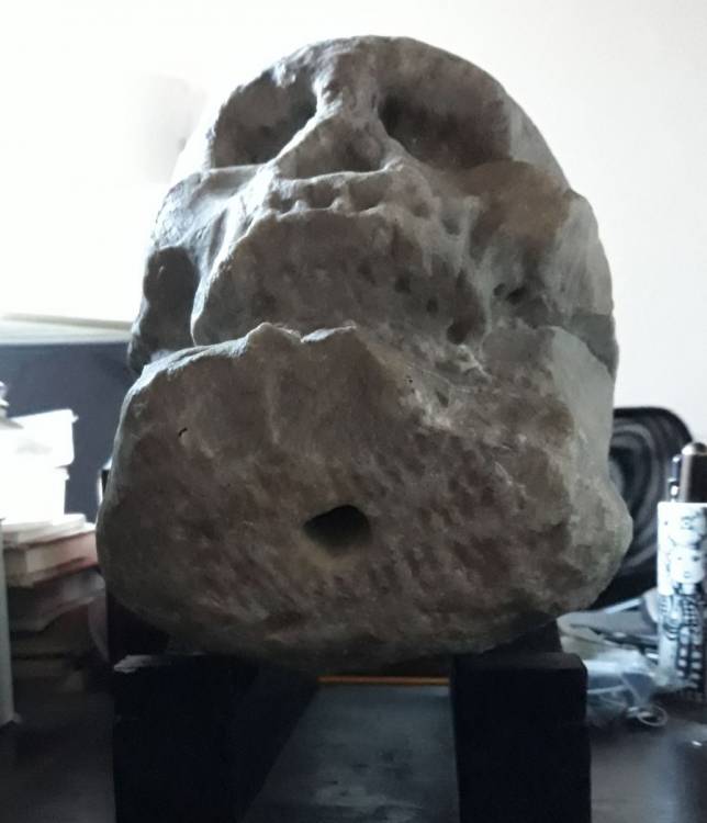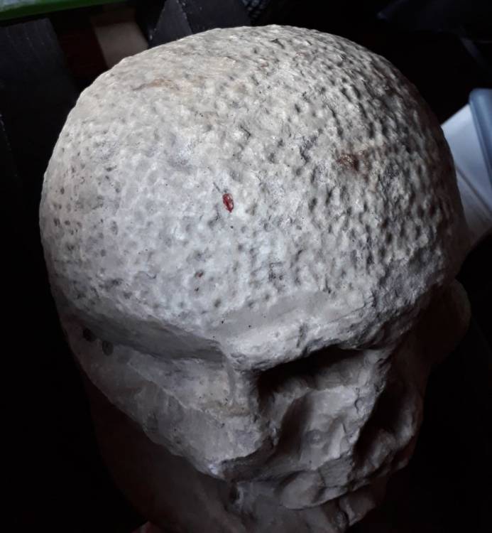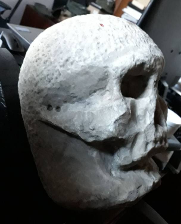 RARA SCULTURA IN MARMO RAFFIGURANTE UN TESCHIO (΄MEMENTO MORI΄). SCOLPITA A TUTTO TONDO EMANA UNA FORZA PROFONDA. TROVATA NELLE SEGRETE DEL CASTELLO DI _____________ NEI DINTORNI DI SIENA, RISALE ALLA FONDAZIONE DEL CASTELLO NEL XII SECOLO.