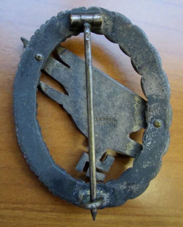 BREVETTO DA PARACADUTISTA DELLA LUFTWAFFE. IN KRIEGSMETAL, CORONA ARGENTATA CON AQUILA DORATA. MARCATO "G.H.OSANG DRESDEN". BELLA PATINA. ORIGINALE BELLICO.