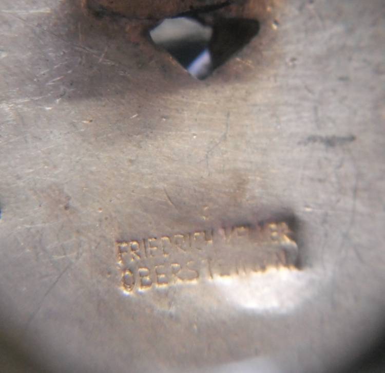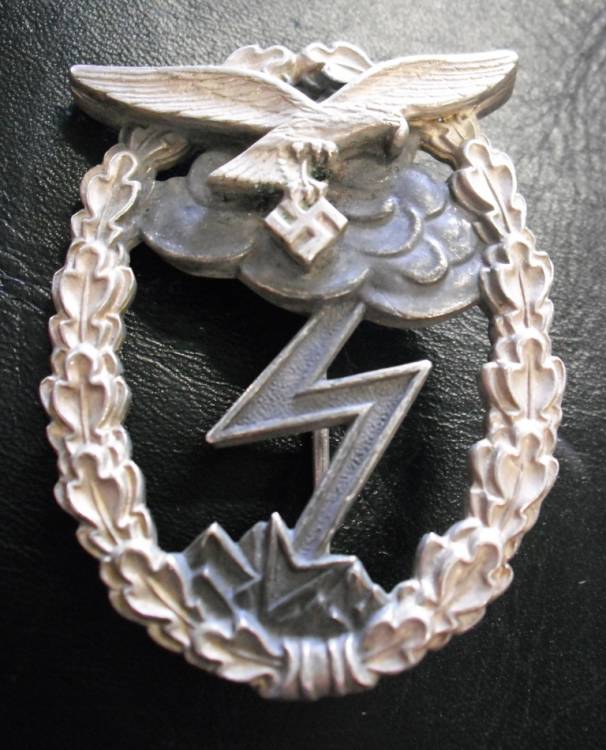 DISTINTIVO PER ASSALTI A TERRA DELLA LUFTWAFFE. PER FALLSCHIRMJAGER E FELD-DIVISION. IN TOMBAK, IN DUE PEZZI, NON RIVETTATO. AQUILA E CORONA ARGENTATE, NUVOLA E FOLGORE BRUNITE. MARCATO "FRIEDRICH KELLER-OBERSTEIN"