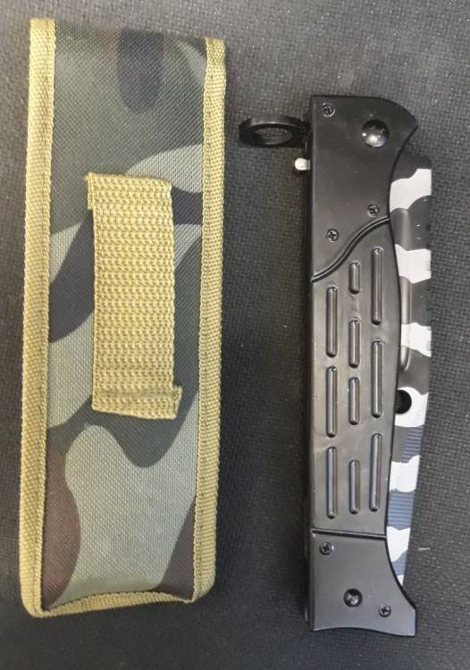 BELLA BAIONETTA/PUGNALE PIEGHEVOLE MIMETICA A SCATTO PER AK.47 MODELLO LUNGO (34 cm.). SACCA IN CORDURA MIMETICA PER IL TRASPORTO. LAMA MARCATA ´AK.47 CCCP´.