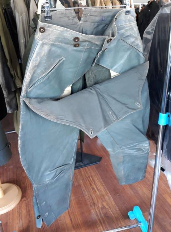 BELLISSIMI E RARI PANTALONI CON PATTA ANTERIORE IN PELLE GRIGIA DA UFF. DELLA KM SOMMERGIBILISTI.