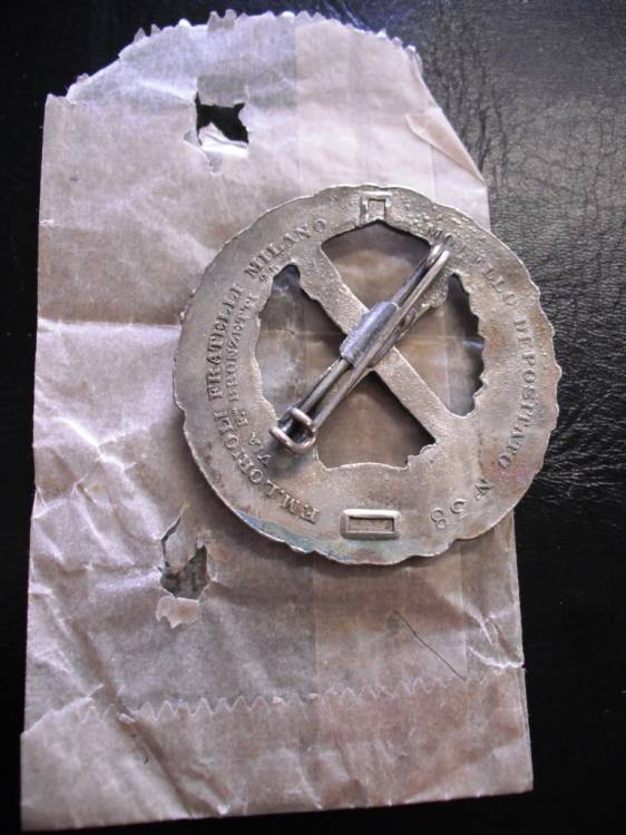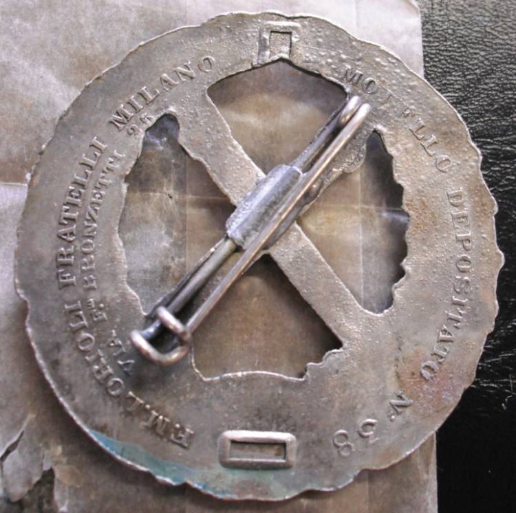 DISTINTIVO COMMEMORATIVO PER I REDUCI DELLA CAMPAGNA DI RUSSIA 1941-43. IN ZAMA. AL RECTO DUE SCIABOLE COSACCHE(SHASHKA) INCROCIATE, SORMONTATE DA UN NODO SAVOIA, INSCRITTE IN UNA CORONA DI FOGLIE DI QUERCIA E ROVI, CON CARTIGLIO RECANTE L´ISCRIZIONE "FRONTE RUSSO" EVIDENZIATA IN AZZURRO. SUL RETRO SPILLA TRASVERSALE SALDATA AL CENTRO; ISCRIZIONE, A RILIEVO, DEL FABBRICANTE "F.M. LORIOLI FRATELLI MILANO-via bronzetti 26" E "MODELLO DEPOSITATO N°38". CON BUSTINA DI CONFERIMENTO IN CARTA DI RISO. PERFETTO. DI INDUBBIA ORIGINALITA´.