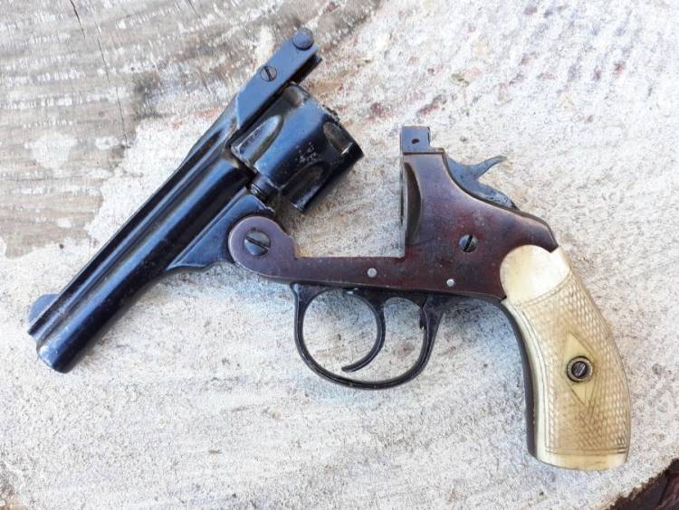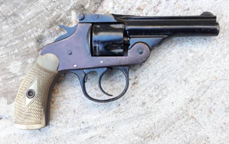 BEL REVOLVER BELGA A PERCUSSIONE CLONE S.&W. IN BRUNITURA NERA E MELANZANA, CAL.32. GUANCETTE BIANCHE IN OSSO. FUNZIONANTE. CONDIZIONI MOLTO BUONE.
