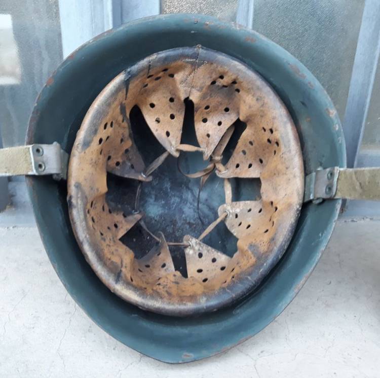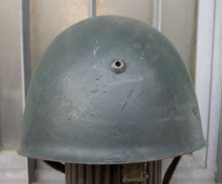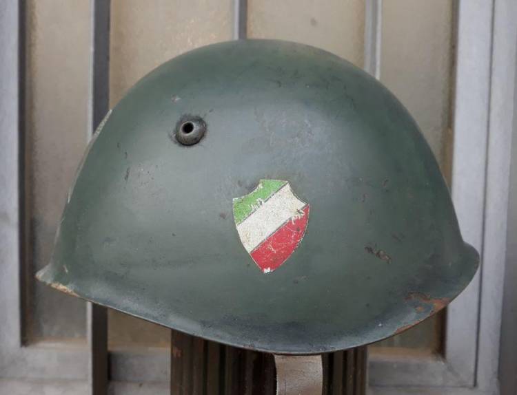 ELMETTO DELLA REPUBBLICA SOCIALE M.33 BIFREGIO DELLA DIVISIONE ITALIA (SCUDETTO NAZIONALE A DESTRA). AQUILA NERA E SCUDETTO IN DECALCOMANIA. COMPLETO DI INTERNO E DI SOGGOLO.