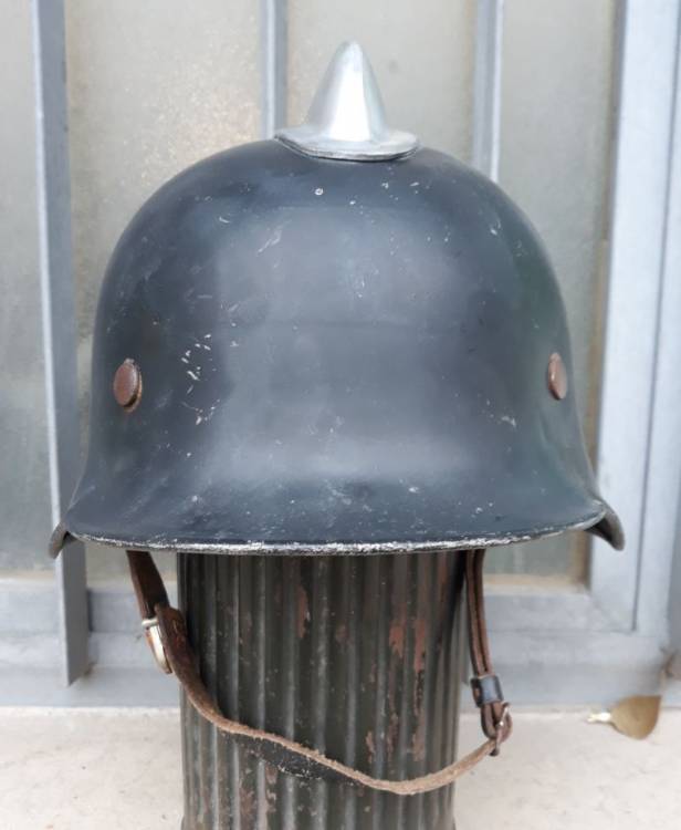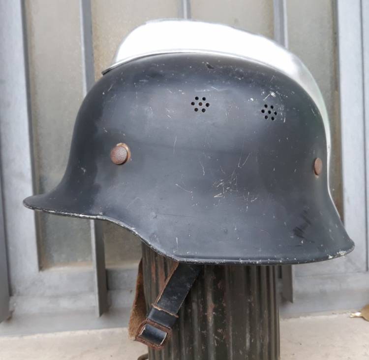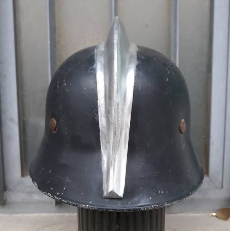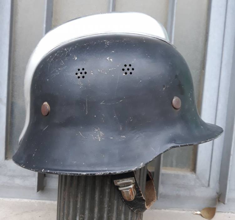 ELMETTO DELLA FEUERWERKE (VIGILI DEL FUOCO) TEDESCHI MOD. 1934. NERO CON CRESTA IN ALLUMINIO LUCIDO. COMPLETO DI INTERNO E SOGGOLO. CONDIZIONI BUONE.