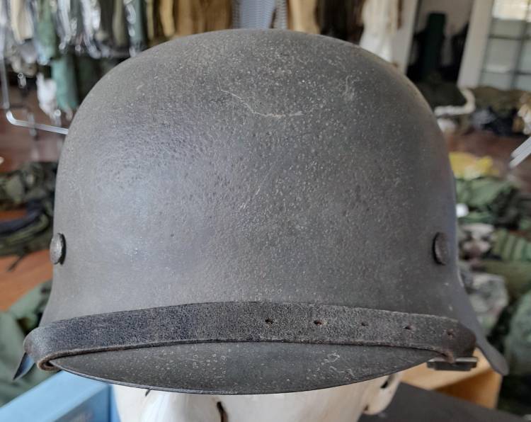 RARO ELMETTO M.42 MONOFREGIO DELLE WAFFEN SS CON DECAL A SINISTRA (VOLONTARI). COMPLETO DI INTERNO E SOGGOLO. MARCATO NELLA FALDA CON IL NUMERO DI SERIE. CONDIZIONI BUONE.