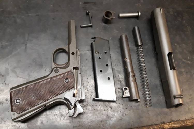 PISTOLA COLT 1911-A1 PRODOTTA DALLA ITHACA NEL NAGGIO DEL 1944. VECCHISSIMA DISATTIVAZIONE, CONSERVA ANCORA I MOVIMENTI E LO SMONTAGGIO. RARA.