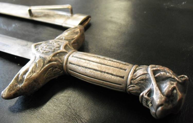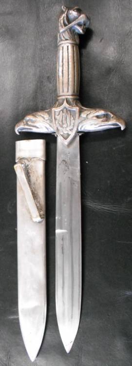 PER UFFICIALI (MODELLO ARGENTATO) DELLA LEGIONE MUTILATI E INVALIDI DELLA M.V.S.N. (Milizia Volontaria Sicurezza Nazionale) REALIZZATO IN ZAMA RAMATA E ARGENTATA. LAMA SENZA ISCRIZIONE "FROSOLONE". MANICO OTTENUTO DA FUSIONE UNICA: GARDIAMANO A FORMA DI TESTE DŽAQUILA CON AL CENTRO SCUDO CON FASCIO LITTORIO RACCHIUSO ALLŽINTERNO, DA UN LATO, E SIMBOLO DELLA LEGIONE (TRE BAIONETTE INTRECCIATE CON UNA CORONA CIRCOLARE DI FILO SPINATO) RACCHIUSO ALLŽINTERNO DELLO SCUDO, SPECULARMENTE, SUL LATO OPPOSTO. TERMINALE DEL MANICO A FORMA DI TESTA DI LEONE. BELLA PATINA DŽEPOCA. MOLTO RARO.